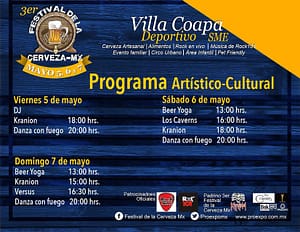 El FESTIVAL DE LA CERVEZA MX se realizara en el Deportivo SME Villa Coapa del 5 al 7 de Mayo a partir de las 11:00 AM, cerrando puertas el viernes 5 y sábado 6 a las 10 PM y el domingo 7 a las 8 PM.