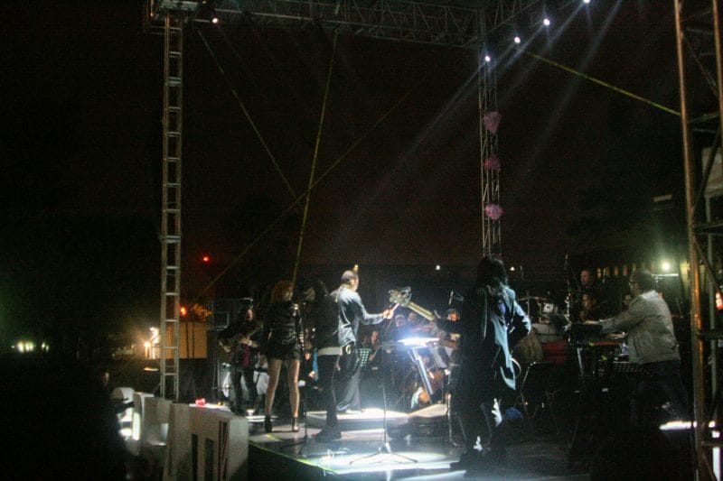 Las razones son muy variadas, aparentemente una parte del escenario colapsó y eso evitó que comenzaran a las 7, aunque también varios músicos estaban preocupados por la lluvia con comentarios sobre la tensión de las cuerdas o la integridad de los instrumentos de madera flotando en el aire.