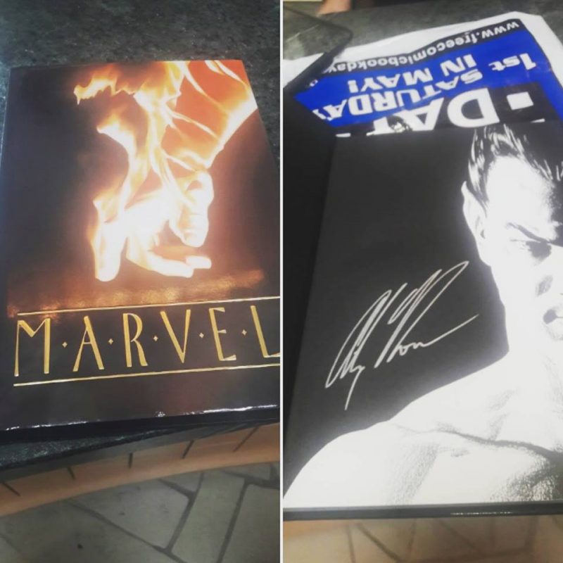 La fila no era tan larga, pero se tomaba su tiempo Alex en platicar con la gente y tomarse la foto. Después de esperar pacientemente, y de ver maravillado, las cosas que llevaban a firmar (un chavo traía en una maleta, que en su interior tenia, las 4 primeras ediciones de Kingdom Come, con una graduación de 9.8, ya firmadas), llego mi comic (un TP de Marvels de pasta dura), ya firmado.