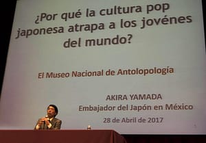 El pasado viernes 28 de abril de 2017, se realizó una conferencia en el auditorio Jaime Torres Bodet del Museo Nacional de Antropología a cargo del Embajador de Japón en México Akira Yamada titulada: ¿Por qué la cultura pop japonesa atrapa a los jóvenes del mundo?