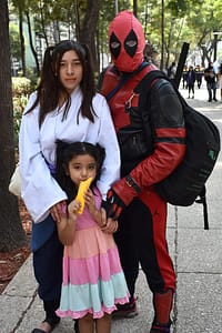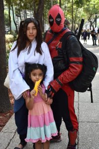 No sabía si mejor retirarme directo a la estela de luz para cumplir con el objetivo, fue entonces cuando vi a una familia, caminado por la sombra, fui con ellos a presentarme y preguntarles. Ricardo, Andrea y la pequeña Bárbara, me cometan que el calor está muy pesado, en el caso de nuestro amigo Deadpool (lo bueno fue que no era quien quería una foto muy cercana anteriormente) llevaba ya 4 marchas, su esposa es la primera junto con Bárbara, aunque no traía disfraz la niña estaba con toda la actitud apoyando a sus padres, divirtiéndose al ver los personajes.