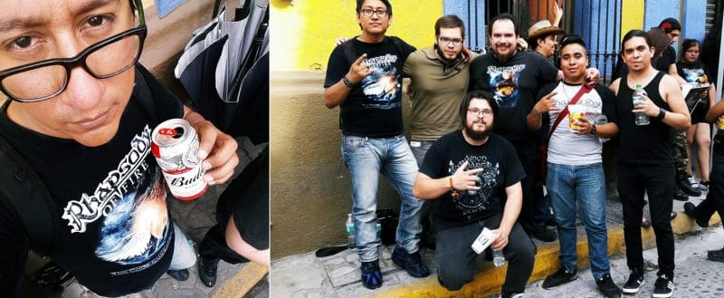 La espera: arribamos en el uber al lugar a las 4:30 pm, al bajar, se sentía de inmediato la expectativa en el ambiente, como sucede por lo general en este tipo de conciertos muy esperados y de culto , la espera entre los primeros asistentes de la ‘fila’ en su mayoría obviamente locales-regios y algunos otros que nos contaron desde Coahuila habían hecho el viaje. La amena charla y la buena camaradería transcurría con la tarde y con el avance de las horas también lo hacia el calor a pleno en Monterrey, rebasando la sensación térmica los 40º, un caloron de los mil diablos, que fue combatido con las respectivas ‘chelas’ y la tradicional pizza conseguida a un costado del local Mientras intercambiábamos nuestras experiencias y conversábamos acerca de Rhapsody, ahí conocí a varios buenos broders como: Fernando Wick. Johnathan Fridén, Mario Rodriguez ‘el compi’ y Ramiro Garza, varios de ellos incluso acababan de lanzarse por la mañana al Crowne Plaza, hotel donde se hospedaba la banda, pero también se lanzaron una noche antes! obteniendo así las tan buscadas firmas y sus respectivas fotos.