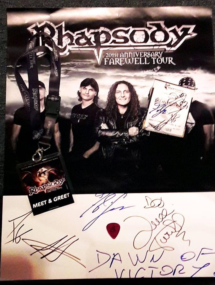 La emoción de saludar y ver directamente a los ojos a esta superbanda, intercambiar palabras, estrechar saludos es simplemente un momento que se congela en el tiempo. Aproveche para que me firmaran el boleto, y de paso la plumilla de Luca Turilli que puso sus iniciales «LT» al reverso, un tipazo realmente muy sencillo y agradecido de que estuviéramos con ahí. Al llegar con Fabio le agradecí y le dije que había sido un gran show, el se sonríe y me da las gracias, en un momento fascinante, porque ademas de su firma en color azul en mi lamina, le pedí que escribiera de su puño y letra el nombre de una de mis canciones favoritas, «claro..!!» dijo: ¡Dawn of Victory!