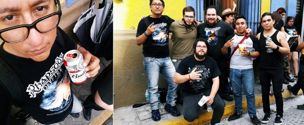 La espera: arribamos en el uber al lugar a las 4:30 pm, al bajar, se sentía de inmediato la expectativa en el ambiente, como sucede por lo general en este tipo de conciertos muy esperados y de culto , la espera entre los primeros asistentes de la ‘fila’ en su mayoría obviamente locales-regios y algunos otros que nos contaron desde Coahuila habían hecho el viaje. La amena charla y la buena camaradería transcurría con la tarde y con el avance de las horas también lo hacia el calor a pleno en Monterrey, rebasando la sensación térmica los 40º, un caloron de los mil diablos, que fue combatido con las respectivas ‘chelas’ y la tradicional pizza conseguida a un costado del local Mientras intercambiábamos nuestras  experiencias y conversábamos acerca de Rhapsody, ahí conocí a varios buenos broders como: Fernando Wick. Johnathan Fridén, Mario Rodriguez ‘el compi’ y Ramiro Garza, varios de ellos incluso acababan de lanzarse por la mañana al Crowne Plaza, hotel donde se hospedaba la banda, pero también se lanzaron una noche antes! obteniendo así las tan buscadas firmas y sus respectivas fotos.