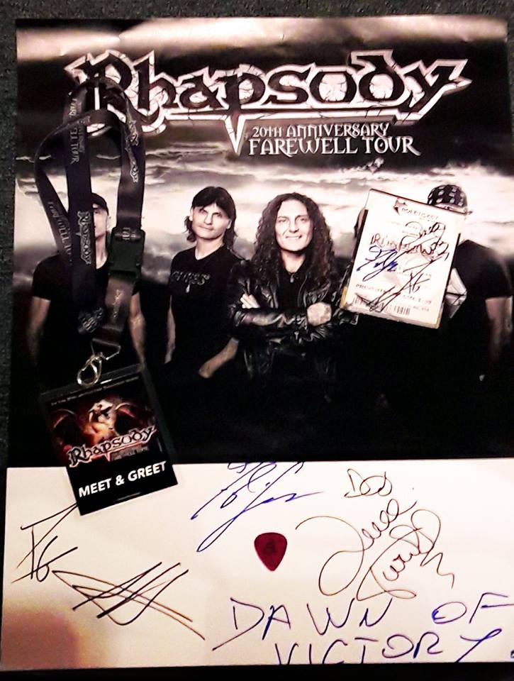 La emoción de saludar y ver directamente a los ojos a esta superbanda, intercambiar palabras, estrechar saludos es simplemente un momento que se congela en el tiempo. Aproveche para que me firmaran el boleto, y de paso la plumilla de Luca Turilli que puso sus iniciales «LT» al reverso, un tipazo realmente muy sencillo y agradecido de que estuviéramos con ahí. Al llegar con Fabio le agradecí y le dije que había sido un gran show, el se sonríe y me da las gracias, en un momento fascinante, porque ademas de su firma en color azul en mi lamina, le pedí que escribiera de su puño y letra el nombre de una de mis canciones favoritas, «claro..!!» dijo: ¡Dawn of Victory!