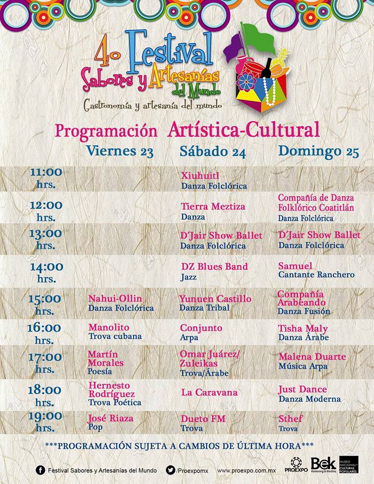 Se cuenta con un Programa Artístico-Cultural en el que participan grupos de danza folklórica, moderna, árabe y tribal, cantantes y grupos de trova, pop y un conjunto de Arpa. Este sera un evento muy completo y familiar para poder disfrutar de un fin de semana diferente, no te lo puedes perder, el 4º. Festival Sabores y Artesanías del Mundo se llevara acabo del 23, 24 y 25 de Junio en el Museo Nacional de Culturas Populares, ubicado en Av. Miguel Hidalgo 289, Coyoacán, CDMX de 11 a 20 Hrs. este evento es gratuito organizado por Proexpo.