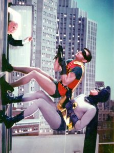 Adam West cuyo doble papel en la serie tanto como Batman como la del elegante millonario, empresario y filantropo Bruno Díaz propietario de la mansión West en las afueras de la ciudad gótica; una ciudad gótica donde no todo el tiempo era de noche y no se la pasaba lloviendo, este era un Batman mas colorido, esta era una serie dispuesta a conquistar corazones infantiles, nadie pensaba en que el señor Díaz y su joven ayudante Ricardo Tapia el que secretamente era Robin tuvieran una relación de pareja, eran épocas mas inocentes y además para justificar el que dos hombres pudieran vivir juntos se agrego el personaje de la tía Harriet Cooper (interpretada por la simpática actriz Madge Blake) fueron los primeros asomos de una relación «padre e hijo» con su fiel mayordomo Alfred (este representado por Alan Napier) así es; esta serie marco mucho de lo que después sería toda la mitología del hombre murciélago.