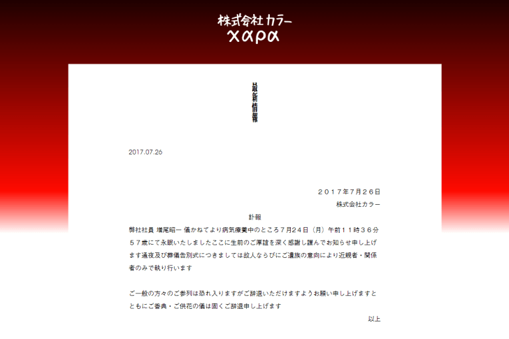 Studio Khara ha publicado una carta abierta en su sitio oficial revelando que el Director de Animación y Efectos Especiales, Shoichi Masuo ha fallecido el 24 de julio de 2017 debido una enfermedad a la edad de 57 años.