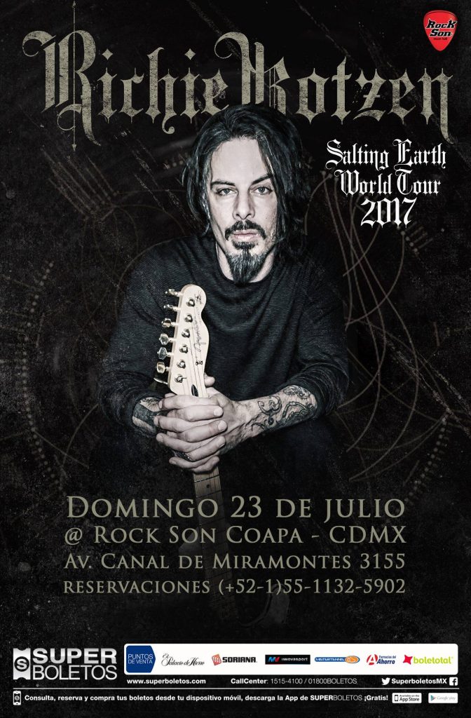 Con un estilo particular interpretando el rock, blues y jazz, hasta el R&B y Soul, RICHIE KOTZEN se presentara por unica ocacion en ROCK SON COAPA este Domingo 23 de Julio a las 8 PM, presentando los temas de su nuevo disco “Salting Earth”, ademas de recordar los éxitos de su carrera. Ofreciendo un único concierto en el área metropolitana, para después partir a Guadalajara y Monterrey como parte de su gira mundial «Salting Earth World Tour 2017″.