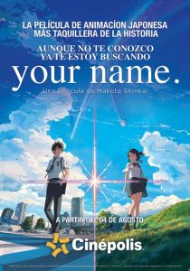 Una de las peliculas mas taquilleras de los ultimos años habia sido «El viaje de chihiro», hasta que llego YOUR NAME, esta pelicula, animación japonesa, estrenada en 2016, con una historia de ciencia ficción y fantasía, es escrita y dirigida por Makoto Shinkai, a cargo de CoMix Wave Films y distribuida por Tōhō. Inspirada en la novela del mismo nombre escrita por Shinkai, fue publicada el 18 de junio de 2016. Masayoshi Tanaka es diseñador de personajes y la banda japonesa Radwimps compuso la música de la película. En su estreno en la convención Anime Expo 2016, cautivo a los presentes y despues en Los Ángeles el 3 de julio de 2016 llegaria a las pantallas de Norte america, tarde se estrenó oficial en Japón el 26 de agosto de 2016, en la Anime Expo 2016, posteriormente habría sido licenciada por Funimation gracias al exito que habria logrado durante la gira de estreno. posteriormente llegaria a Mexico en esta ocacion presentada en la cadena Cinepolis apartir de 4 de agosto.