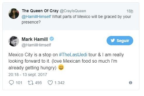 «Ciudad de México es una parada en la gira #TheLastJedi y estoy deseando que llegue. (me encanta la comida mexicana tanto que ya estoy teniendo hambre) ?» Mark Hamill contesto en su cuenta del pajarito azul.
