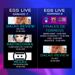 Ahora EGS LIVE te ofrece nuevas experiencias, contará con: Realidad Virtual, eSports, personalidades, cosplay, música, fiesta, foros, educación y mucho más. Podrás convivir con grandes celebridades como Mario Valle, Nadiasonika, Ophelia Pastrana La Explicatris, Cherrigan Caster, entre otros invitados especiales.