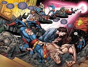 Es en este punto en donde comienza la Convergencia, es justo después de esa esa confrontación donde Superman cae en un planeta desolado y se encuentra con todas las versiones de Brainiac y se entera la verdad, de que todos los Brainiac que se vieron solamente son “ecos” del verdadero, así pudimos ver al Brainiac que era Humano, al Robotico, al de All Star, todos ellos, El Dios de Metal, un ser gigante que roba ciudades enteras de diferentes tiempos y universo para tenerlas en un único planeta mosaico. Y el Brainiac que estaba viendo Superman en ese momento no era su enemigo, si no, el cuidador de esas ciudades que luego toma el nombre de Telos y sería el enemigo principal de Convergencia. Ya que Telos haría luchar a las ciudades entre sí para saber que universo era el mejor.