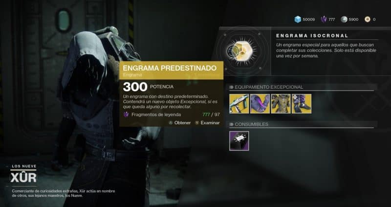 Xur ahora aparte de vender armas y piezas de armaduras excepcionales, también nos ofrecerá un engrama especial que nos garantizará un arma o pieza que no tengamos en nuestra colección, así mismo también nos ofrecerá un nuevo ítem que funcionará como “Las Tres Monedas» de Destiny 1.