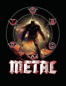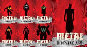 Batman se vuelve el conducto para la oscuridad, para la entrada a los seres del multi universo oscuro, los Batmen de Metal. Cada uno es una versión de Bruce Wayne, cada uno proveniente de un mundo del multiverso oscuro y es contra parte de cada miembro de la liga de la justica: esta Murder Machine, contra parte de Cyborg; The Dawnbreaker es un símil oscuro de Green Lantern; The Red Dead es el velocista oscuro, similar a Flash, The Drowned es la parte femenina de los murciélagos oscuros, contra parte de Aquaman, Batman Merciless está ligado a Wonder Woman de su mundo, y se trasforma en una figura sin piedad; Batman The Devastator es Bruce Wayne infectado por una cepa del virus Doomsday; todas esta versiones oscuras son guiadas por el Batman que ríe y sirven a la entidad oscura que pretende dominar y terminar con el multiverso.