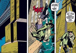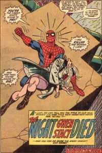 Spider-Man desconsolado trata de culpar al Green Goblin de lo sucedido pero dentro de si sabe que él fue quien dejó morir al amor de su vida. Es entonces cuando Spidey se da a la tarea de buscar a Goblin para buscar venganza, pero lo busca en su casa pero no lo encuentra, lo encuentra en una destartalada guarida del Duende en un almacén abandonado, en cuyo curso el trepamuros pierde por completo los estribos para golpear con rabia al Green Goblin. Se detiene, claro, en el último momento porque se da cuenta de que el no es un Asesino, y que eso es algo que Gwen no hubiera querido, y es así que da ocasión a Osborn para intentar un ataque a traición con su planeador dirigido por control remoto y clavarlo en las espaldas del trepamuros. El infalible sentido arácnido lo alerta en el último instante, y Osborn es empalado por su propio artilugio, como si se tratara de un vampiro.