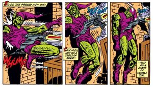 Al recordar esto, intenta ir tras de Peter Parker pero no lo encuentra y al llegar a su departamento encuentra a Gwen y la rapta, es cuando Peter lo ve y lo persigue, llegan al Puente George Washington, en donde un disminuido Spider-Man por el resfriado no puede pelear al 100%, Durante la ardua batalla con el Green Goblin, Spider-Man se ve con la difícil tarea de salvar a Gwen Stacy de una caída. Spider-Man en su desesperado intento de salvarla lanza sus telarañas con la finalidad de salvarla, pero olvídala algunas reglas básicas de la gravedad y al momento de atraparla, Gwen muere rompiéndose el cuello.