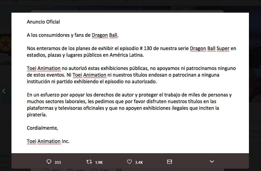 La posición del estudio es clara en que condenan cualquier proyección no autorizada, sin embargo en el mismo tweet, Crunchyroll LATAM afirma que se encuentran en diálogos para convertir esas proyecciones ilegales en eventos con permiso: