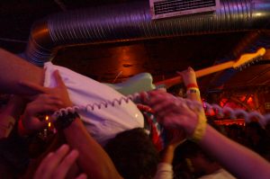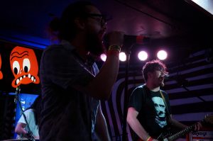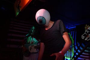 Al volver a ingresar el chico de seguridad solo me saluda y ya no revisa mis cosas, subo rápido porque la banda ya está tocando, de inmediato saco mi cámara y me acerco al frente, comienzo a tomar alguna que otra foto, las reviso y no me convencen, tomo otras más e incluso del público que de inmediato arma el slam, siento los empujones, veo un performance gracioso donde el protagonista es una máscara de un ojo que posee a quien se la coloca. Durante el show el guitarrista baja del escenario interactúa con el respetable, en su mayoría millenials que disfrutan del distor cabronamente y del slam como si se tratará de una banda ochentera con toques de surf, el guitarrista de un momento a otro decide lanzarse al público, es atrapado y paseado por un momento con todo y su guitarra, así a la Jack Black en Escuela del Rock.