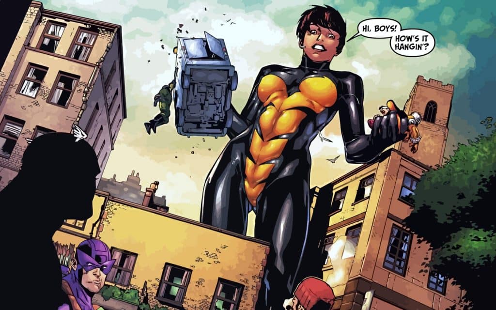 Janet van Dyne es seleccionada como miembro de los Poderosos Vengadores por Carol Danvers y Tony Stark como parte de la Iniciativa Cincuenta del Estado.Durante su intento de destruir a la humanidad, ella determina correctamente que Ultron ha tomado el cuerpo de Iron Man.Cuando los simbiontes alienígenas atacan a Nueva York, Janet usa una fórmula de crecimiento refinado que le dio Hank Pym, que es en realidad un impostor Skrull, que le permite cambiar a un tamaño gigante sin efectos secundarios. Durante el comienzo de la pelea, ella es brevemente convertida en un monstruo simbionte antes de que Stark cree una cura.