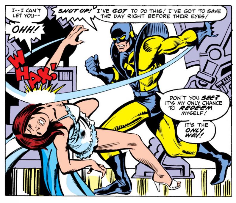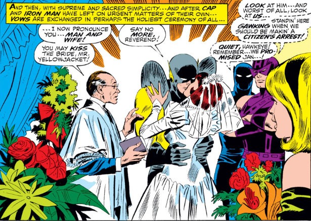 Janet van Dyne descubre que su esposo, ahora paranoico, autoritario y abusivo verbalmente, ha preparado un plan para verse bien frente a los Vengadores al organizar un ataque que solo puede ser detenido por el instigador. Cuando ella intenta disuadirlo, Hank la golpea; ella se divorcia de él poco después y toma un breve descanso del equipo.