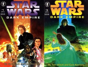 La saga del Imperio Oscuro es escrita justo al mismo tiempo que la Trilogía del almirante Tharwn. En un principio los autores de Imperio Oscuro tenían cierta rencilla con Timothy Zahn sobre cuál sería la secuela definitiva de la historia original de Star Wars, dicho pleito los termino el mismo Lucas haciendo que Imperio Oscuro fuera una continuación de la saga escrita por Zahn. Dark Empire es publicada por Dark Horse Comics en 1991, consta de 3 miniseries, Dark Empire, Dark Empire 2 y Empire´s End. La historia se sitúa entre uno y tres años del desenlace de la trilogía del almirante Tharwn, donde los remanentes del imperio se reúnen alrededor de la figura de Darth Sidious renacido por clonación y se centra en la lucha de Luke Skaywalker por vencer el creciente poder del lado oscuro, lucha que sucede dentro del mismo también. Si bien el cómic va de bueno a regular, es una historia que puede interesar a muchos seguidores de la Fuerza.