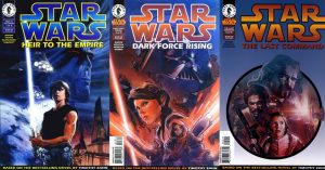 Originalmente la trilogía del almirante Tharwn se publicó en una serie de novelas, escritas por Timothy Zahn en 1991 con el permiso explícito de George Lucas. La narrativa era fluida y bien lograda y supo mantener la secuencia de tiempo, tan influyente que muchos de los elementos en ella son tomados por Lucas para la trilogía de precuelas. En 1995 es llevada al cómic por Dark Horse Comics, bajo la batuta Mike Baron en el guion y acompañado de diferentes grupos creativos en cada número de la miniserie. Adaptar un bestseller a cómic nunca da buenos resultados, en la transición se pierde un poco del tono épico que tienen los libros, sin embargo, las historietas son de los mejor que se publicó en los noventa, en Dark Horse y ligado al tema de Star Wars, con trazos sublimes y un trabajo de entintado y color impecable, recuerden que es un cómic antes de la era de la digitalización.