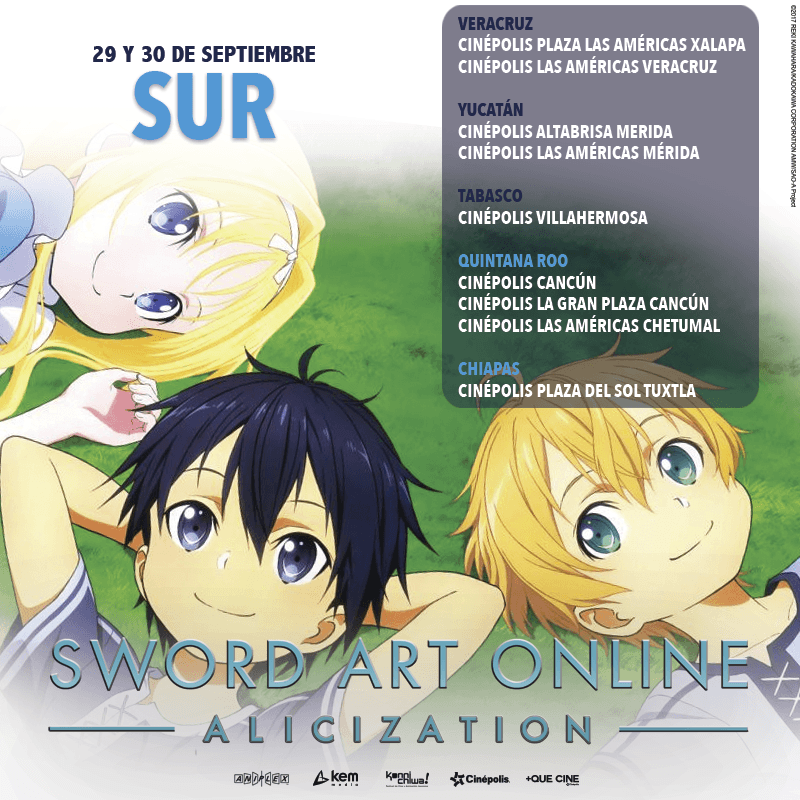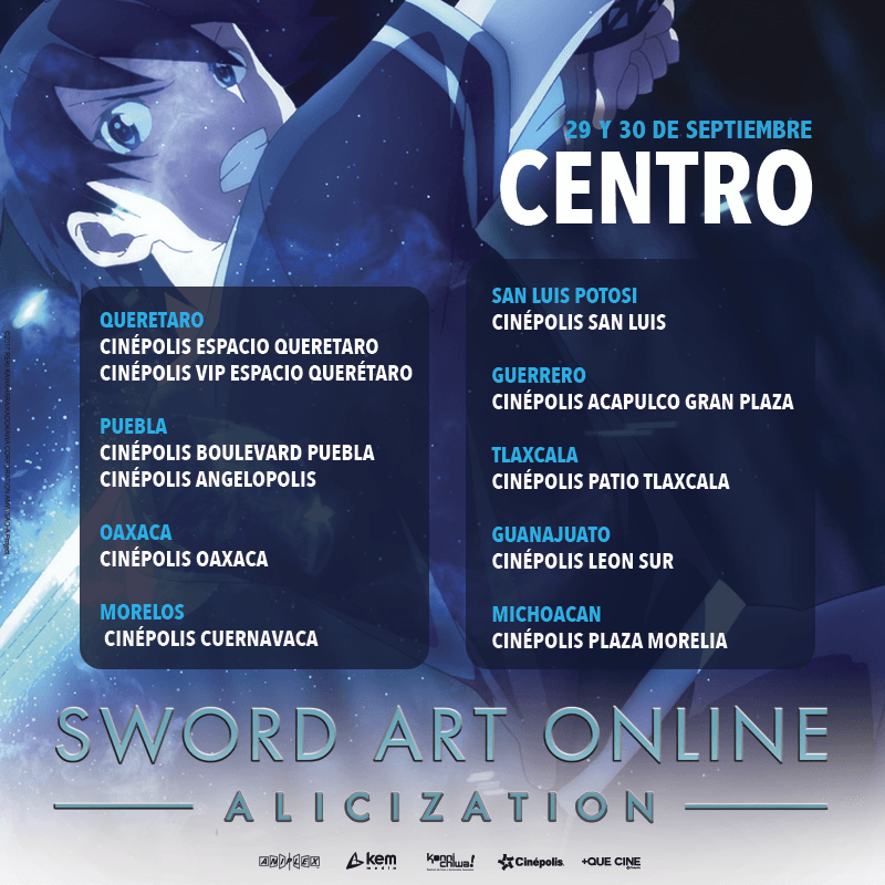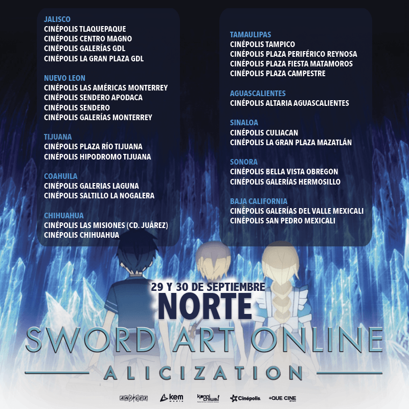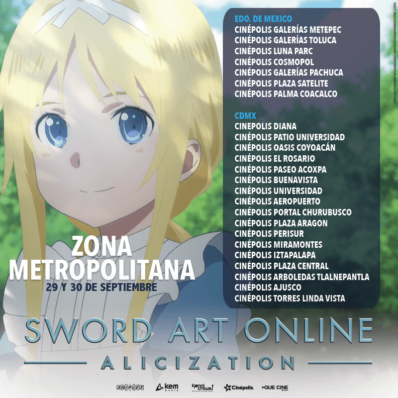 El estreno de Sword Art Online: Alicization será exhibido en los siguientes complejos de Cinépolis alrededor de la república mexicana, para más información sobre la preventa pueden consultar la página de +QueCine.