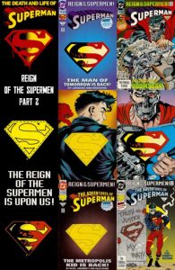 Mientras el mundo aún lamenta la muerte de su héroe más querido (al menos, en el Universo DC), aparecen tres hombres que afirman ser Superman, aunque cada uno de ellos porta un traje y una actitud bien distinta. El primero, llamado Hijo de Krypton, guarda algunos recuerdos del Superman original, pero su comportamiento es muy diferente: es violento, frío e implacable. No duda en aplicar correctivos desproporcionados a los delincuentes, provocando incluso la muerte de varios de ellos, algo que el Superman original juró no hacer nunca. El segundo es un Superman ciborg que, si bien es más parecido a Superman en su actitud contra el crimen, ha perdido partes de su cuerpo original y han sido reemplazados por prótesis cibernéticas de metal kriptoniano. Su carne posee el ADN de Superman, pero es parte robot. El tercero es un clon de Superman creado en el laboratorio del Proyecto Cadmus y envejecido de forma acelerada artificialmente. Pese a su aspecto juvenil, odia que le llamen Superboy, y su actitud chulesca y desvergonzada, su falta de recuerdos y el hecho de que reconozca ser un clon del original, hacen que no se le pueda considerar una posible reencarnación de Superman.