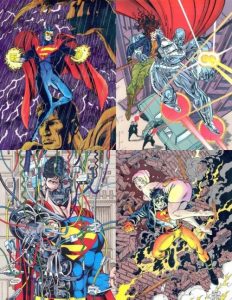 Tratándose de un cómic de los noventa, cayó bajo el embrujo de la oscuridad que envolvió a la mayoría de superhéroes de la época: gafas de sol, chaquetas de cuero, violencia, grandes armas de fuego, miembros cibernéticos… Estos Supermanes adoptaron la iconografía macarra de aquellos años y se la repartieron entre los cuatro. Falta el Superman con mullet que… pero ése llegaría más tarde. Es una historia menos épica que La Muerte de Superman, y desde luego menos emotiva que Mundo sin Superman, pero desde luego supuso la creación de un par de personajes importantes en años venideros como fueron Superboy (una vez regresó Superman no le importó que le llamaran así) y Acero.