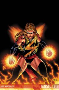 La radiación modificó su estructura genética y la convirtió en un híbrido humano-kree de enormes poderes. Entonces asumió la identidad de Ms. Marvel, con un traje similar al del propio Capitán Marvel, que pronto cambió por uno negro. Trabajó varias veces con los Vengadores y finalmente se unió a ellos cuando la Bruja Escarlata se ausentó. Fue manipulada por Marcus Inmortus, hijo de Inmortus, para irse con el al Limbo.