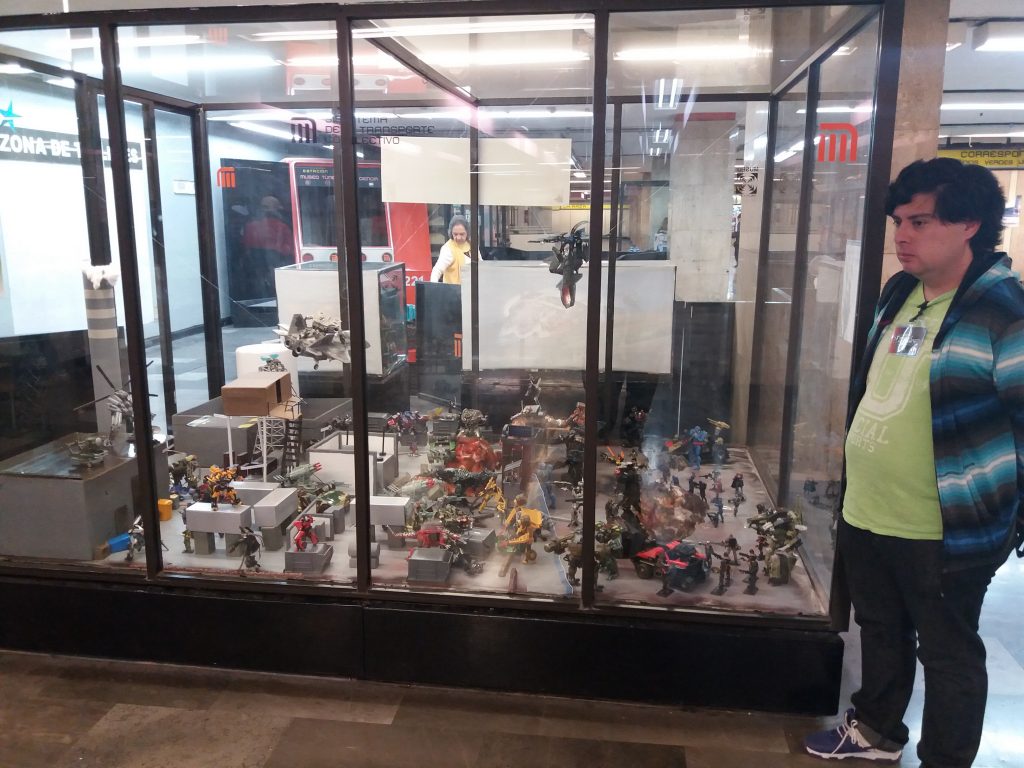 Me encontré a nuestros amigos de Unión Transformex y al Club Mex Joe´s base CDMX, bueno solo al buen amigo Victor Colina también conocido como «El Maquina» que es parte del grupo de Unión Transformex, nuestros amigos tienen una hermosa representación de una batalla entre Autobots y Decepticons, en el Metro La Raza, mas específicamente en el pasillo de la Ciencia.