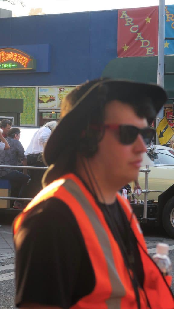 Ya se han mostrado algunas imágenes oficiales de la película, el editor de Vice Los Ángeles nos permitió usar estas imágenes del set de grabación con el que se topó hace unos meses mientras caminaba por Hollywood. Como se puede ver en las primeras imágenes, los elementos de seguridad no dejaban que Jamie tomará fotos, hasta que lo consiguió y el mismísimo Tarantino posó para una de ellas