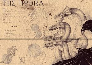 n la mitología griega, la Hidra de Lerna (en griego antiguo Λερναία Ὕδρα) era un antiguo y despiadado monstruo acuático ctónico con forma de serpiente policéfala (cuyo número de cabezas va desde tres, cinco o nueve hasta cien, e incluso diez mil según la fuente) y aliento venenoso a la que Hércules mató en el segundo de sus doce trabajos. La Hidra poseía la virtud de regenerar dos cabezas por cada una que perdía o le era amputada, y su guarida era el lago de Lerna en el golfo de la Argólida (cerca de Nauplia), si bien los arqueólogos han confirmado que este lugar sagrado es anterior incluso a la ciudad micénica de Argos, pues Lerna fue el lugar del mito de las Danaides. Bajo sus aguas había una entrada al Inframundo que la Hidra guardaba.