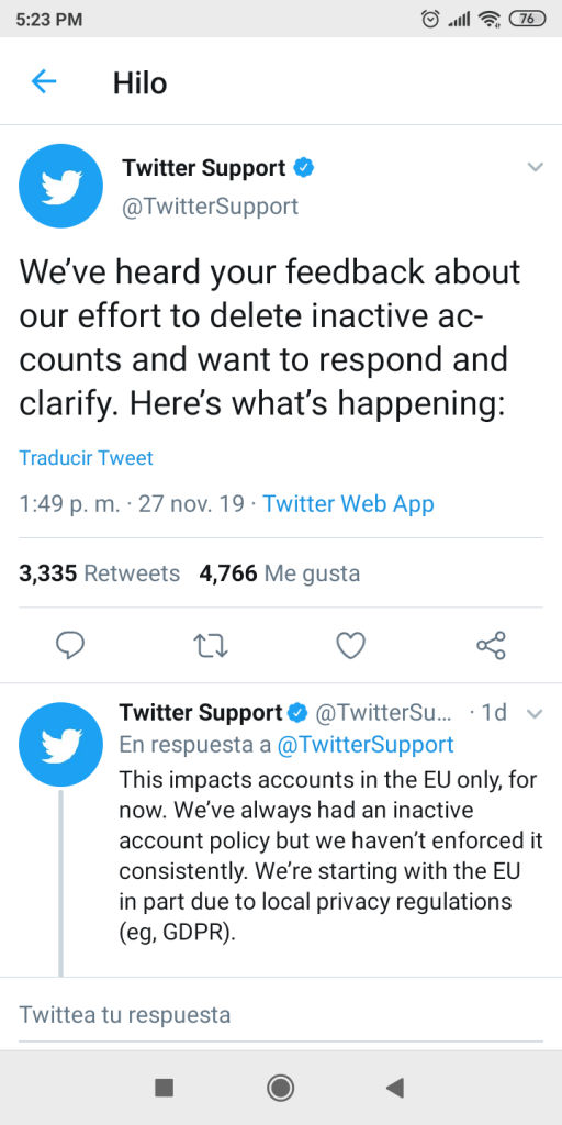 Después de la petición, Twitter anunció que no eliminará ninguna cuenta hasta que haga los ajustes pertinentes para mantener las cuentas póstumas de personas que han fallecido y que de esta forma sus amigos y familiares puedan seguir viendo y compartiendo sus tuits.
