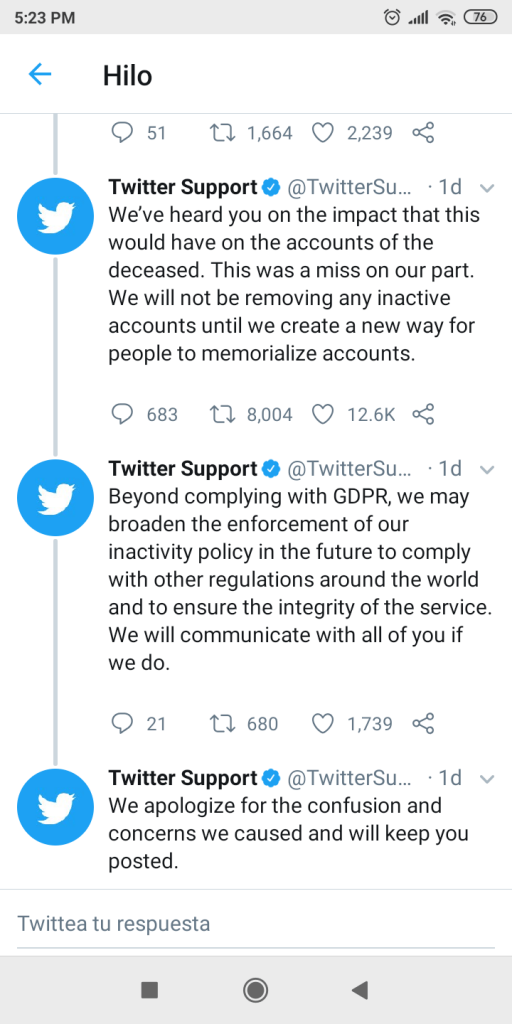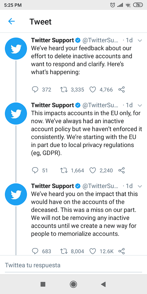 Después de la petición, Twitter anunció que no eliminará ninguna cuenta hasta que haga los ajustes pertinentes para mantener las cuentas póstumas de personas que han fallecido y que de esta forma sus amigos y familiares puedan seguir viendo y compartiendo sus tuits.