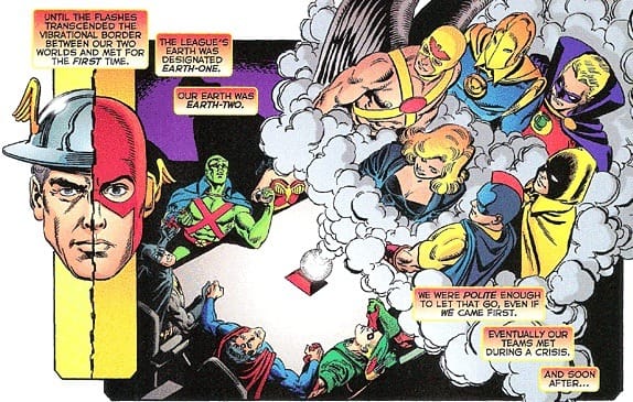 El primer viaje a otro universo paralelo se produjo cuando Flash (Barry Allen) accidentalmente cambió su frecuencia vibratoria coincidiendo con la de Tierra-Dos, donde conoció a Jay Garrick, el Flash de la Época de Oro . Esa reunión dio lugar a años de interacción entre el original equipo de Super-héroes, la Sociedad de la Justicia de América y su más joven contra parte de Tierra Uno, La Liga de la Justicia de América. Como Barry Allen fue el primer viajero, se llevo el honor de nombrar a las dos Tierras por lo que su universo fue llamado Tierra-Uno, el de Jay Garrick se convirtió en Tierra-Dos. Como se señaló años más tarde por el Superman mayor, la Sociedad de la Justicia era demasiado cortés para mencionar que ellos habían sido los primeros.