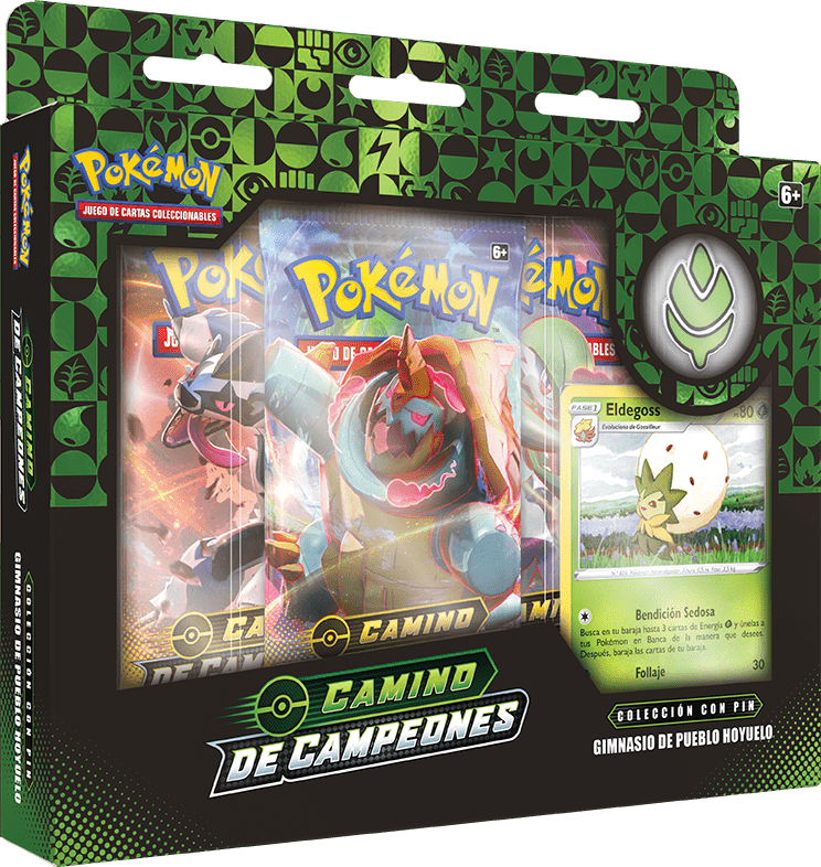 - Colección especial con pin de Camino de Campeones (a la venta el 2 de octubre de 2020): disponible en dos versiones —la de Gimnasio de Pueblo Ladera y la de Gimnasio de Pueblo Auriga—, cada colección con pin incluye los pines de coleccionista de sendos logos de cada Gimnasio, así como 2 cartas holográficas con los respectivos compañeros Pokémon de los dos Líderes de Gimnasio