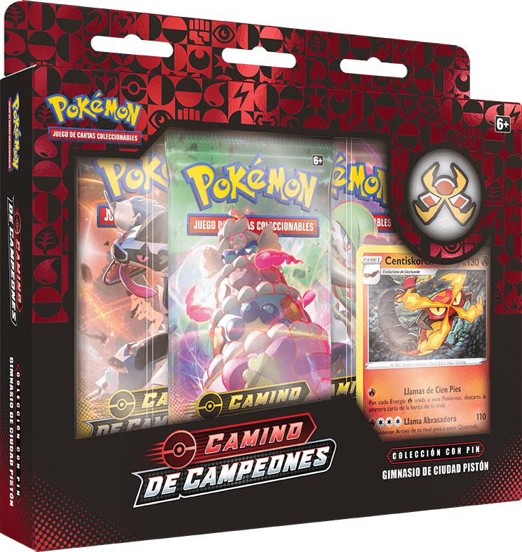 - Colección especial con pin de Camino de Campeones (a la venta el 2 de octubre de 2020): disponible en dos versiones —la de Gimnasio de Pueblo Ladera y la de Gimnasio de Pueblo Auriga—, cada colección con pin incluye los pines de coleccionista de sendos logos de cada Gimnasio, así como 2 cartas holográficas con los respectivos compañeros Pokémon de los dos Líderes de Gimnasio