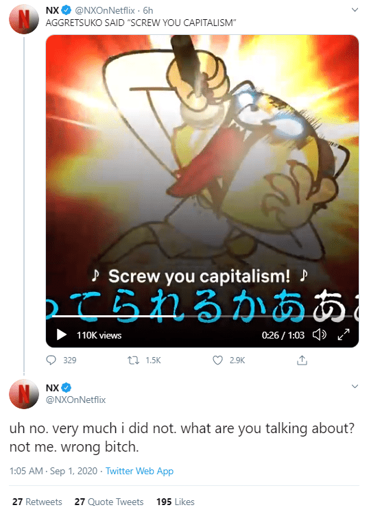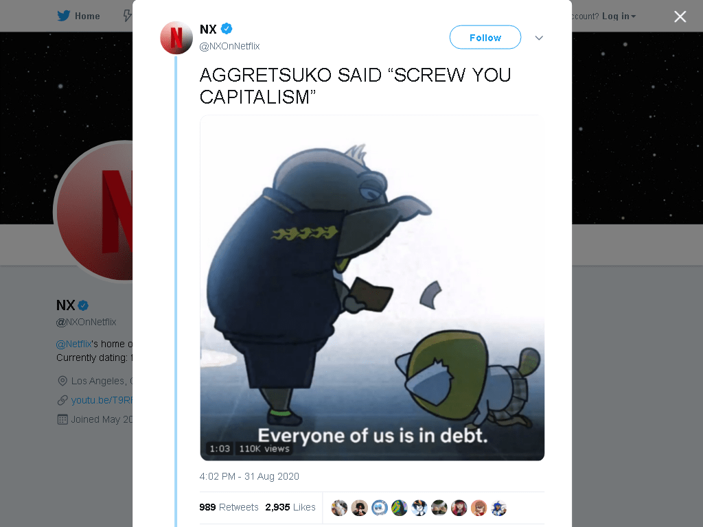 La tercera temporada de la furiosa panda roja amante del metal Aggretsuko de Netflix ha sido estrenada y para promoverla, la cuenta de NXonNetflix en Twitter decidió utilizar un mensaje anti capitalista que rápidamente cayó en oidos sordos.