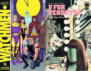 Otro ejemplo de su voz critica son sus dos más grandes trabajos en DC Comics: V for Vendetta y Watchmen. En V… realiza una lectura acertada sobre el sistema neoliberal de mediados de los 80’s. Su protagonista lucha contra un sistema fascista autoritario, inspirado en los gobiernos de conservadores de Reagan y Thatcher. Con Watchmen rompe con el paradigma de los superhéroes, haciéndolos crudos, sombríos y más humanos, señala el estado del mundo, que se vuelve caótico y paranoico ante la amenaza del exterminio nuclear. Ambos trabajos son considerados los mejores de su carrera y base de la nueva forma de escribir comics.