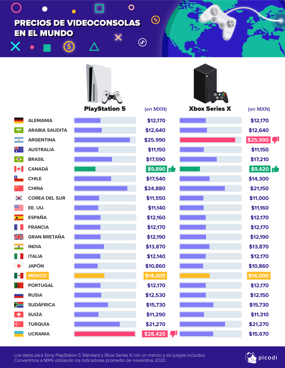Al contrario, Canadá es el país donde la PlayStation 5 y la Xbox Series X tienen el precio más bajo, con un precio de sólo 9,890 pesos y 9,420 pesos, respectivamente.