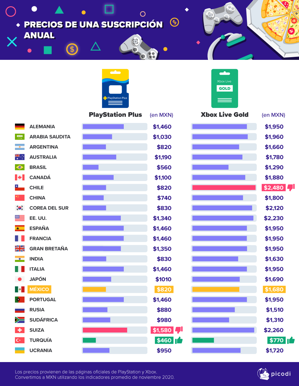 En México, los precios de las suscripciones de PlayStation Plus y Xbox Live Gold son de 820 pesos y 1,680 pesos, respectivamente. Estos precios no son los más elevados, pero los jugadores mexicanos tienen que pagar casi el doble que un jugador de Turquía por el mismo servicio.