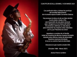 Sax, Eulalio Cervantes Galarza, uno de los miembros fundadores de la banda de rock y ska mexicana La Maldita Vecindad, falleció este 14 de marzo, así lo informo su esposa mediante un comunicado.