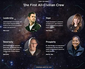 Junto a Issacman viajan la doctora en geociencias Sian Proctor, el consejero del Space Camp Christopher Sembroski y Hayley Arceneaux de 29 años, quien sobrevivió al cáncer y ahora trabaja como asistente medico en el hospital St. Jude.