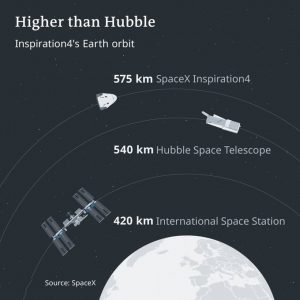 Pero ¿en qué se diferencia este viaje privado a los realizados por las empresas Virgin Galactic y Blue Origin? Mientras que los viajes de las naves de las otras empresas solo volaron unos cuantos minutos y a pocos kilómetros apenas fuera del planeta, el Inspiration 4 volara a una altura de 575 kilometros de altura, mas alto que el Telescopio Hubble, que antes de esto era el objeto humano a mayor orbita en la actualidad, además de dar vueltas alrededor de la Tierra.