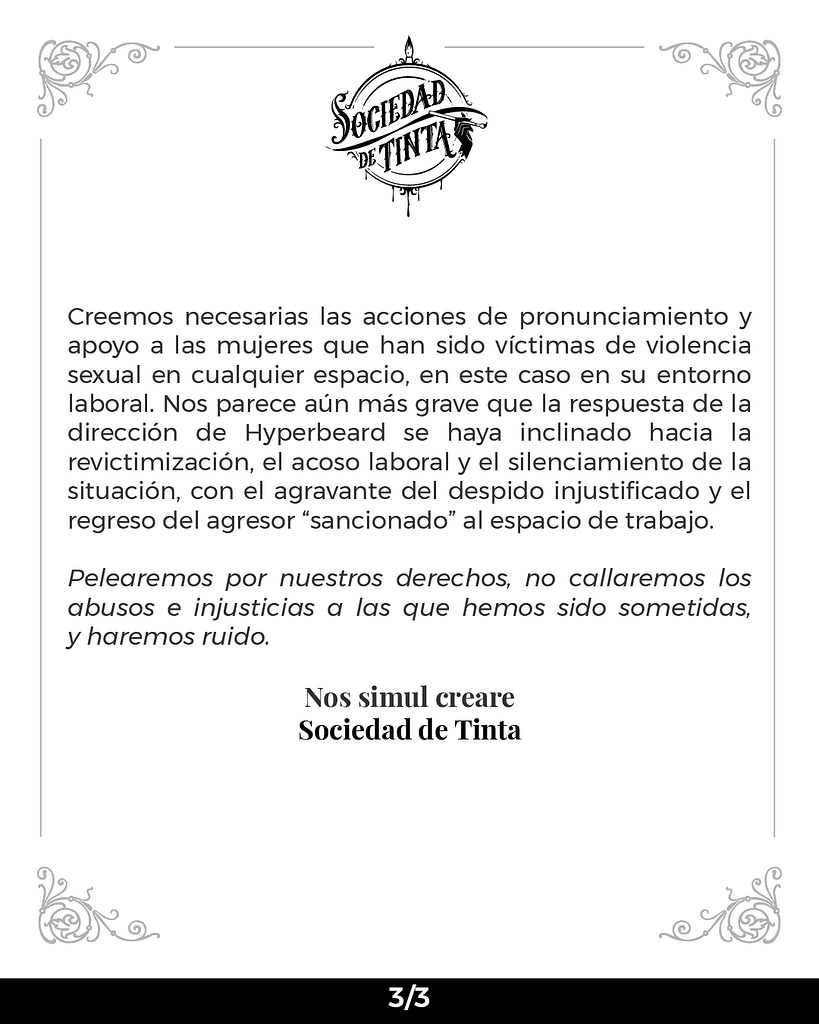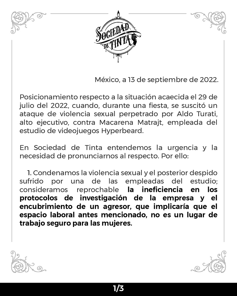 Todo se dio a conocer a través de Twitter, en donde se acusa a Aldo Turati, quien aún es el COO de HyperBeard Games de haber molestado a una compañera de trabajo el 29 de Julio de 2022.