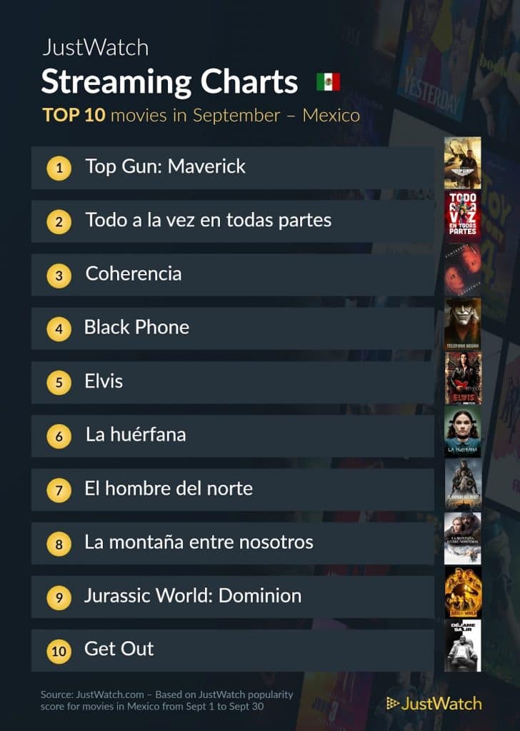 El superhit de taquillas Top Gun Maverick también se encuentra al frente y como número uno en la película más vista en sistemas de streaming en México, Todo a la vez en todas partes en segundo lugar demostrando que el cine asiático se encuentra cada vez más en el gusto popular.