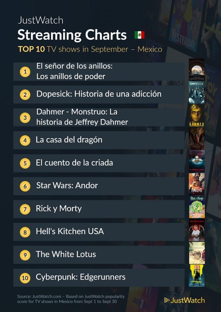 Nuevamente la gente de JustWatch.com colabora con nosotros con algunas de sus listas actualizadas que nos muestran el comportamiento general del público consumidor de servicios de streaming en México, mostrándonos los Top 10 de películas y series más vistos en el país durante el pasado mes de Septiembre patrio.