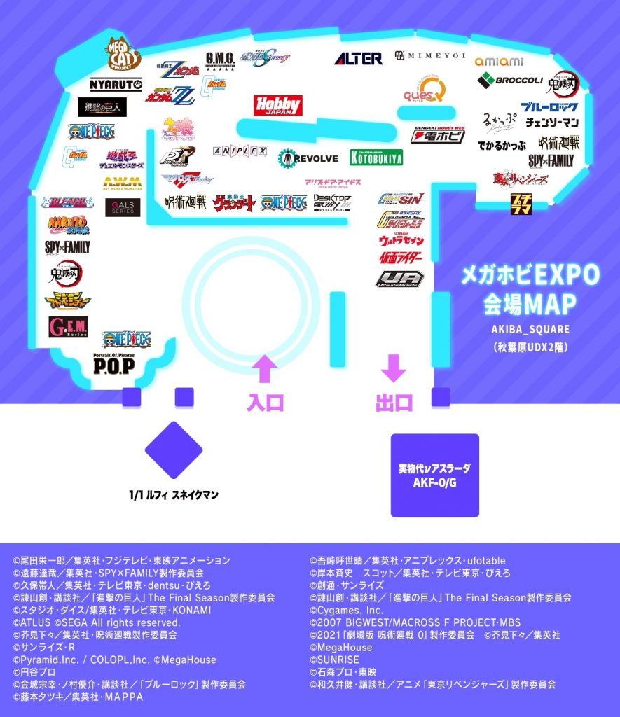 El lugar fuera de línea también tendrá impresionantes exhibiciones en la entrada de MegaHobby EXPO del P.O.P One Piece Monkey D. Luffy «Gear 4» Snakeman que cobra vida en tamaño 1/1 (altura total: aprox. 2 m 60 cm), el tamaño real como visto en el manga, y el Future GPX Cyber Formula SIN v Asurada AKF-0/G Livery Edition de tamaño completo que se exhibirá por primera vez en Japón. El uso de la aplicación para teléfonos inteligentes, Locatone™, también se planea usar para que los populares actores de voz Yoshimasa Hosoya y Yui Ishikawa lleven a los visitantes a un recorrido por el lugar.